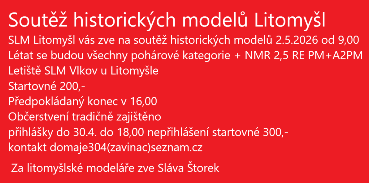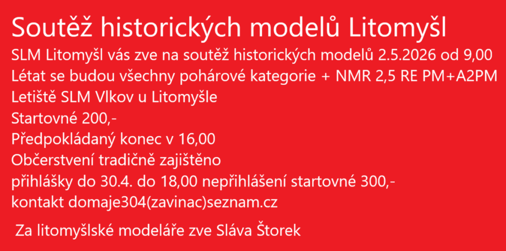 Vážení, máme tady pozvánku na pohárovku, kterou nám zaslal Slávek Štorek. Létá se v Litomyšli 2.5.2026. Jirka Hloušek