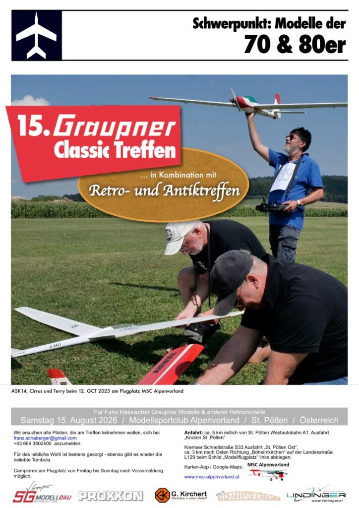 Vážení, již po 15. se koná setkání modelářů a modelů ze stavebnic firmy Graupner. Setkání se koná v Rakousku 15.8.2026 na letišti St. Pölten.