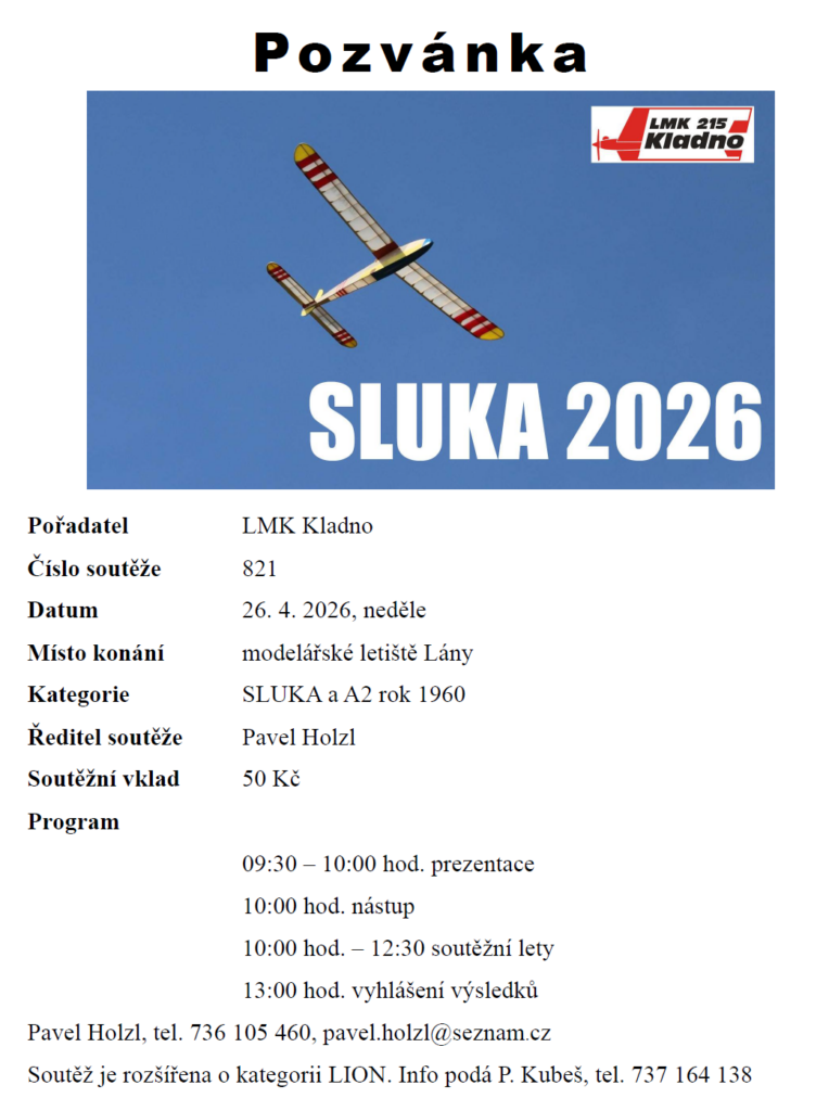 Vážení, máme tady pozvánku na nedělní Sluka Cup. Létá se na Lánech v neděli 26.4.2026. Kromě Sluky se létají A2 a Lioni.