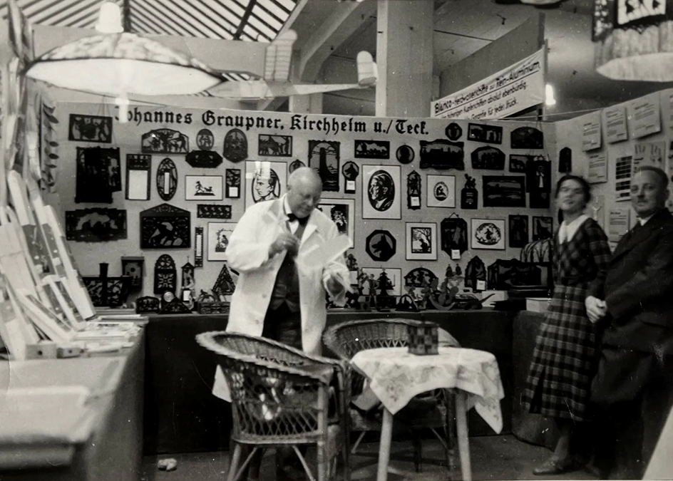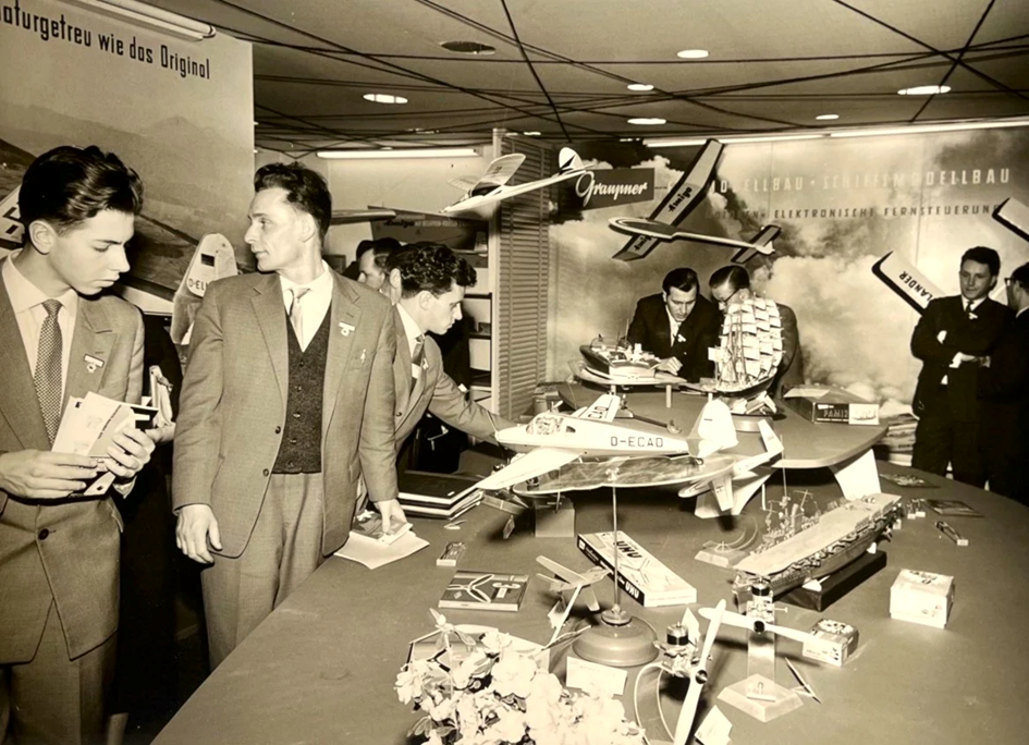 Ale odbočme. Tady je obrázek stánku firmy Graupner z veletrhu v Kolíně v roce 1936. Ještě zde převládají výrobky ze dřeva, spíše taková zateplovadla, ale již zde vidíte vystavený i model z Graupnerovy stavebnice.