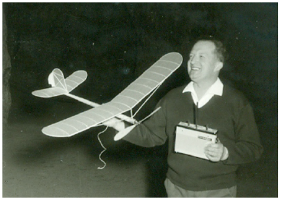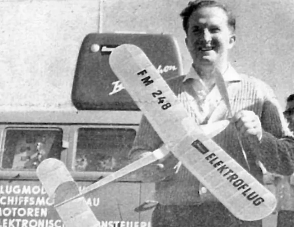 Zde je Fred v roce 1959 před reklamním autem firmy Graupner. Všimněte si, že na střeše auta je „socha“ RC vysílače Bellaphon.
