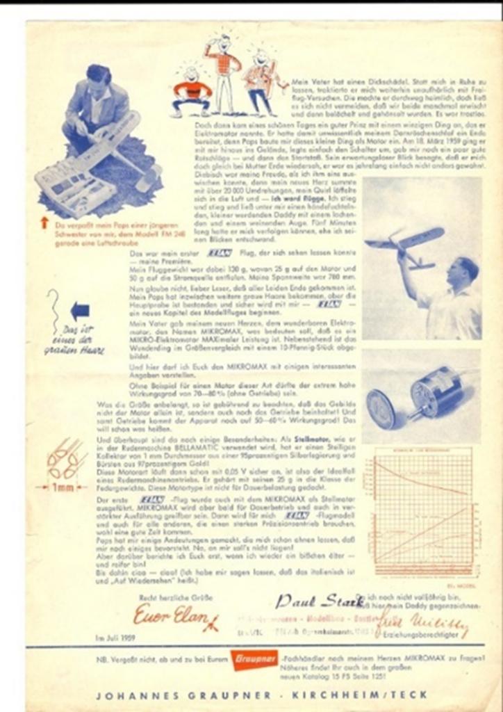 K modelu a jeho motoru se váže následující příběh: V únoru 1959 vešel do kanceláře německého časopisu „Modellflug“ Dr. Ing. Fritz Faulhaber a zeptal se, zda by motor, který vyvinul pro použití v dálkově ovládaných clonách fotoaparátu, mohl být užitečný i pro letecké modely. Motor byl Micromax, s integrovanou převodovkou.